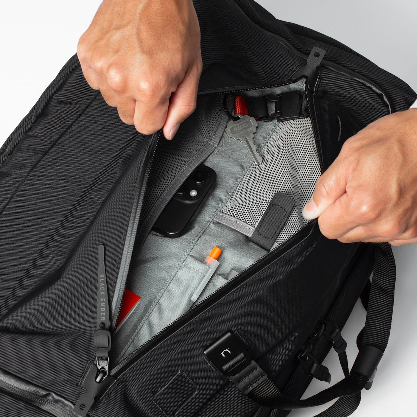 All Black Ember products are made using our BOND-STITCH™ high-precision construction. All textile components are Laser-Cut for precise assembly. This construction yields a weatherproof, durable pack with a blacked-out, minimal aesthetic.