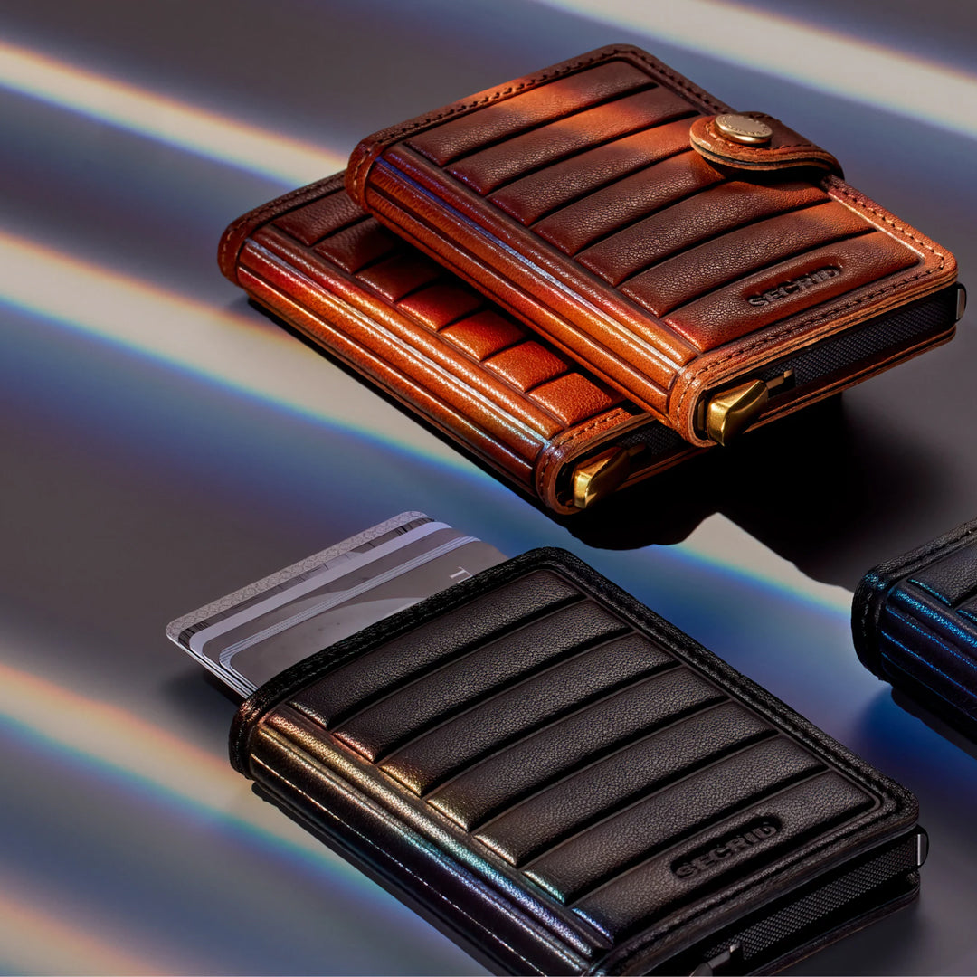 Its slim profile makes the Slimwallet fit perfectly into every pocket. The open exterior is cut extra wide to hold cards, banknotes and receipts.