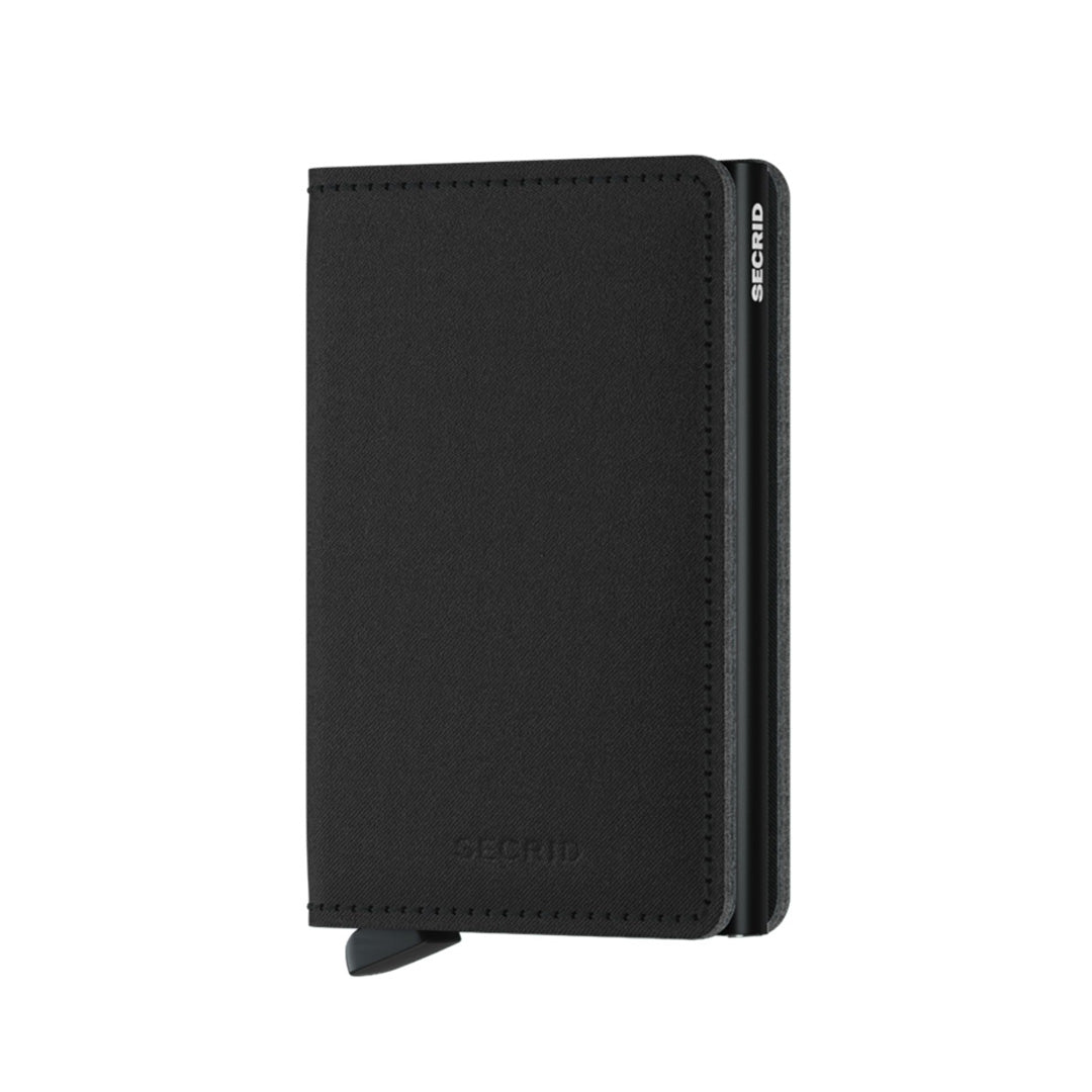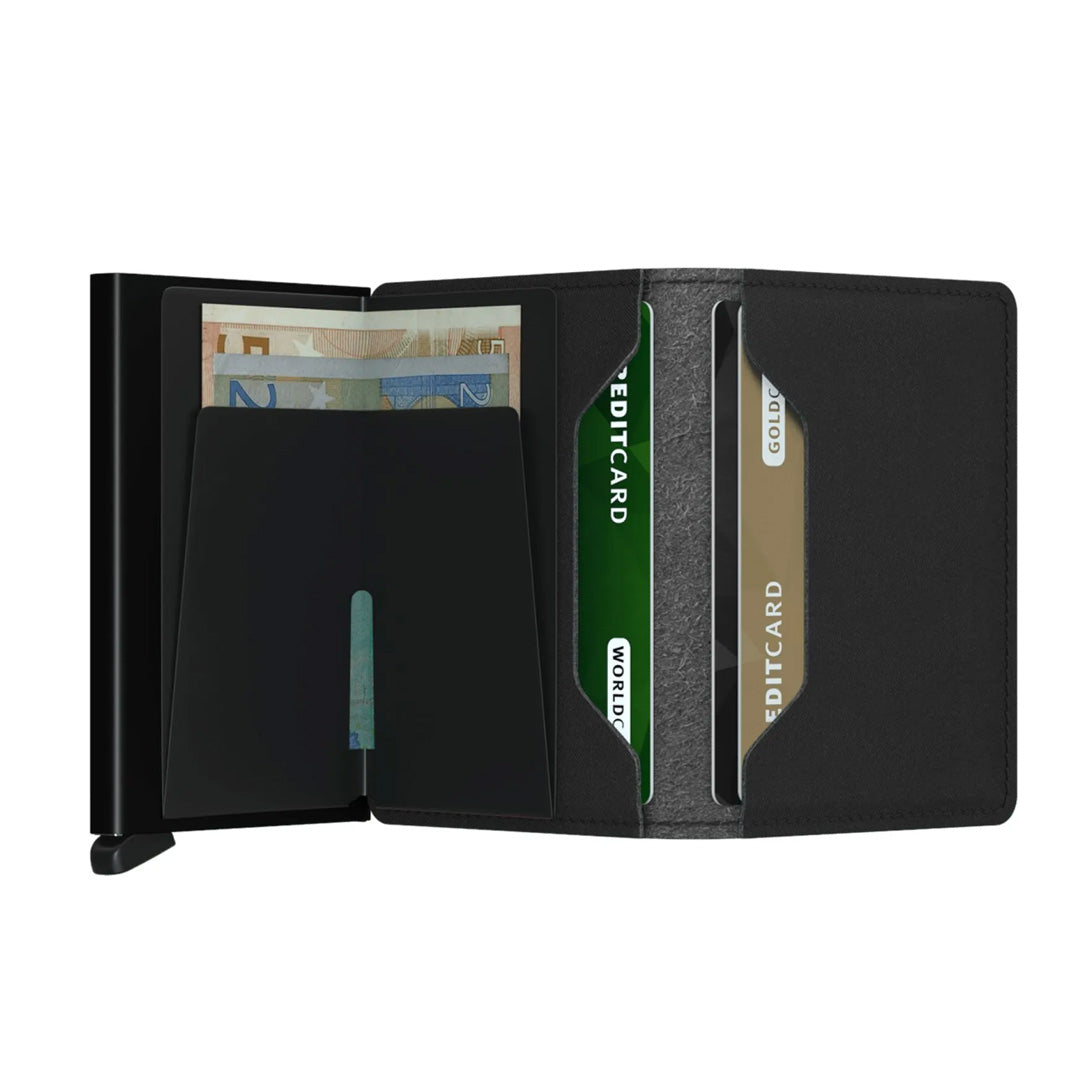 Its slim profile makes the Slimwallet fit perfectly into every pocket. The open exterior is cut extra wide to hold cards, banknotes and receipts.